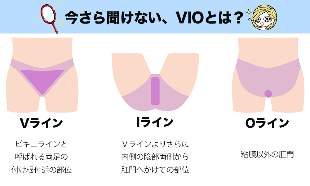 VIOは、デリケートゾーンの脱毛部位として使われている表現です。Vラインとはビキニラインと呼ばれる両足の付け根付近の部位、IラインはVラインよりさらに内側の陰部両側から肛門へかけての部位、Oラインは、粘膜以外の肛門周辺をさします。