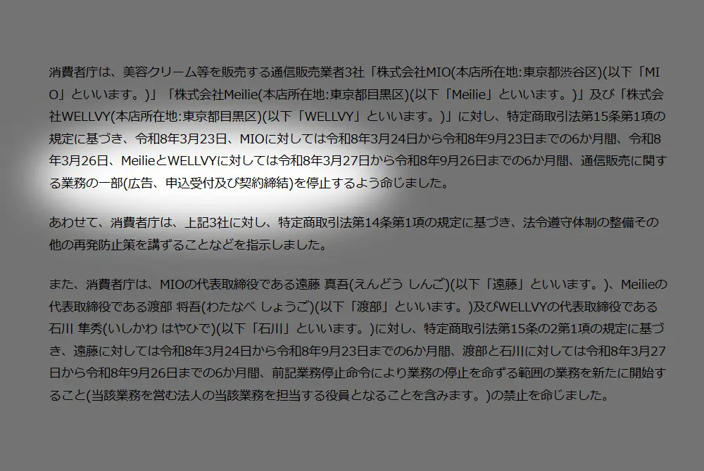 消費者庁は2026年3月19日に公表したピュレアスへの処分に続き、3月27日には美容クリームなどを扱うMIO、Meilie、WELLVYの3社にも、いずれも6か月の業務停止命令を行った。