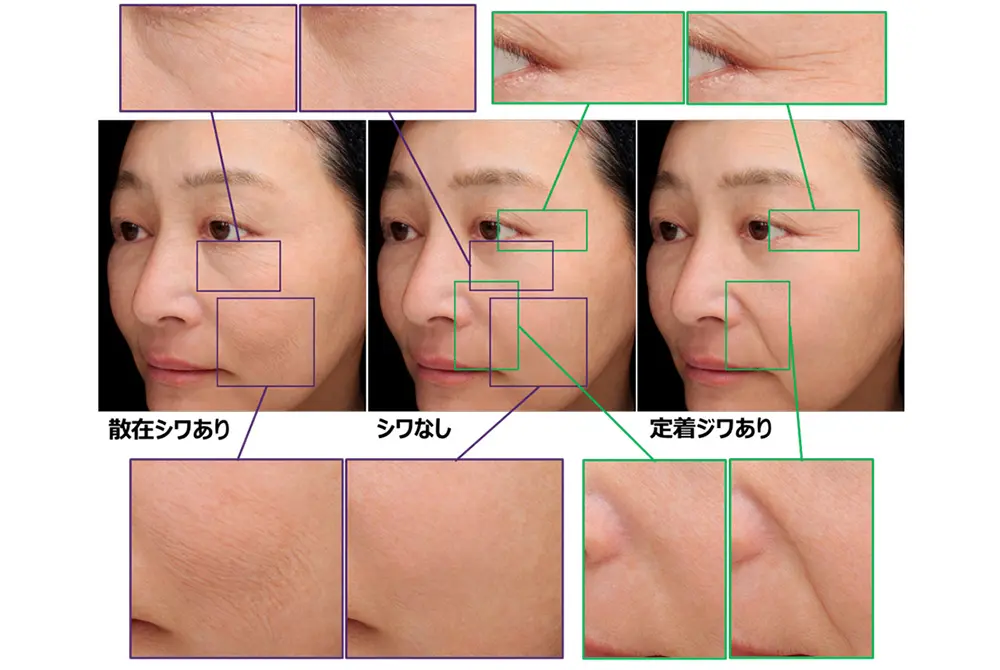 「散在シワ」は肌表面、「定着ジワ」は弾力性